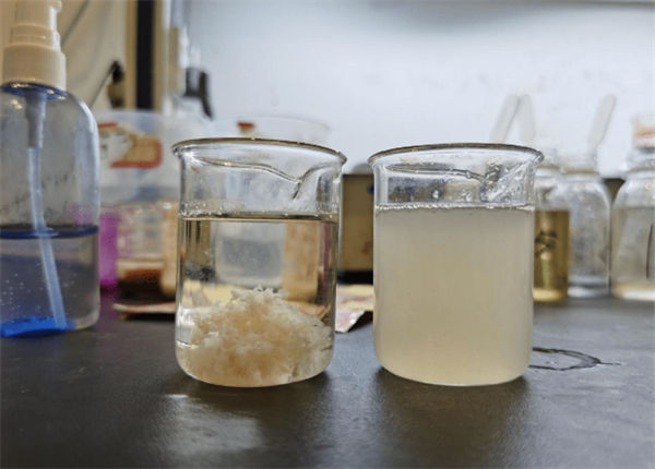 乳膠制品行業的生產中耗水量大,合理處理該廢水是必然事件。白乳膠廢水破乳劑是廢水預處理中投加的絮凝劑,使水中的懸浮物的膠體及分散顆粒在分子力的相互作用下生成絮體,且在沉降過程中它們互相碰撞凝聚,形成絮凝體,后續通過沉淀或氣浮法進行分離,達到清澈。
